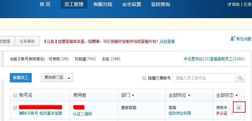 怎么暂时关闭某个子账号? 大文 四月 15, 2016 卖家工具及服务 0 条评论 1956 围观 亲,您需要用主账号登陆子账号管理首页页面,点击【员工管理】,选择想停止使用的子账号后点击“停止”。当子账号停止使用后,则该子账号将不能登录阿里旺旺及后台。