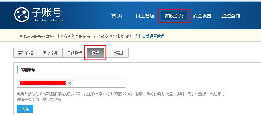 4)检查代理账号,该子账号被设置成代理账号下,其他分流账号都离线时,消息会分给该代理账号(代理账号的设置路径:【子账号管理】-【客服分流】-【设置】)。