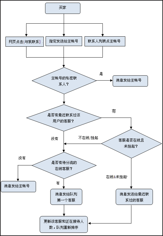 亲,当买家通过网页点击【与我联系】、联系人列表点击主帐号、指定发送给主帐号这三种方式时,买家发送的消息将会按照如下规则进行分流: