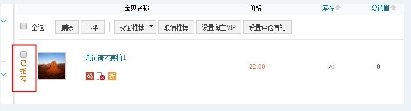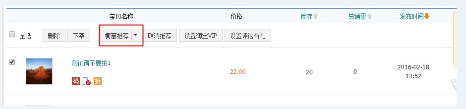 如何把宝贝设置为橱窗推荐? 大文 四月 19, 2016 卖家工具及服务 0 条评论 1737 围观 亲,您进入【卖家中心】-【出售中的宝贝】页面选中需要橱窗推荐的宝贝,然后点击上方的”橱窗推荐”即可。 设置成功后,宝贝左侧会显示”已推荐”的字样。