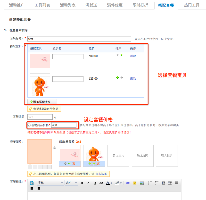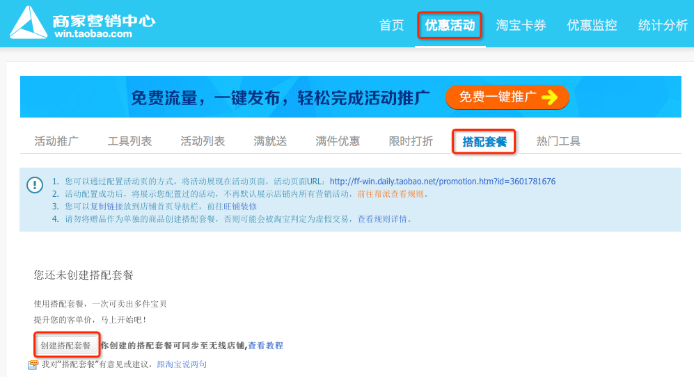 如何设置“搭配套餐”? 大文 四月 19, 2016 卖家工具及服务 0 条评论 1300 围观 亲,首先需要您先去订购官方搭配套餐,可直接点此订购。 您可进入【卖家中心】-【促销管理】-【优惠活动】-【搭配套餐】点击创建搭配套餐。 创建页面如下 创建好的搭配套餐可以查看、编辑或删除