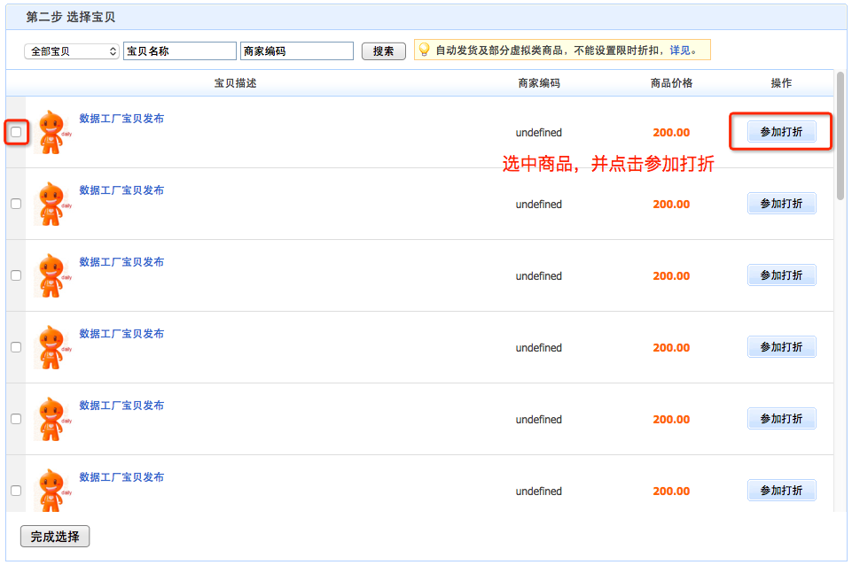 限时打折活动设置要求每个活动最多添加的商品数是20个,且一个宝贝只能出现在一个活动中。