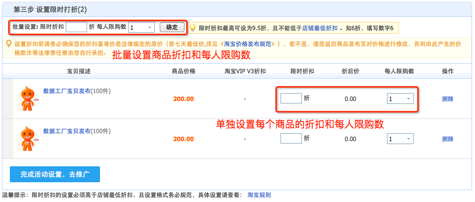 限时打折活动可以分别对每一件商品设置优惠折扣和买家限拍数量,可以有不同的优惠力度,只要是同一个时间段内优惠的商品,都可以放到一个活动里。