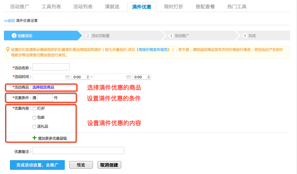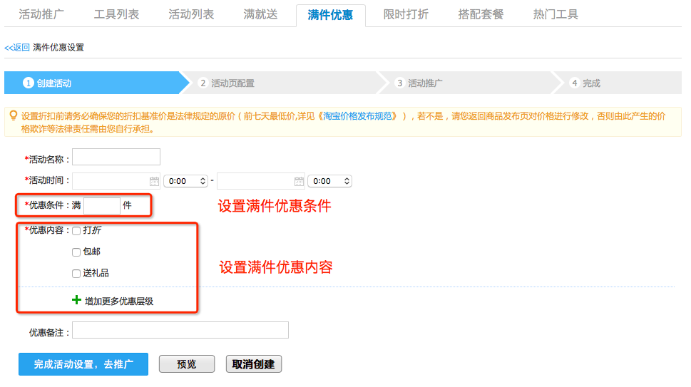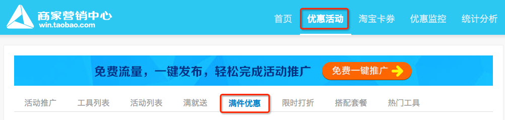 通过卖家中心——促销管理,进入商家营销中心,选择优惠活动中的满件优惠