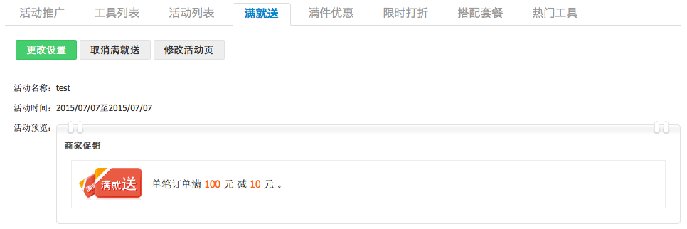 通过卖家中心——促销管理,进入商家营销中心,在优惠活动中可分别查看满就送与满件优惠的活动,在各自的页面可对其更改或取消。
