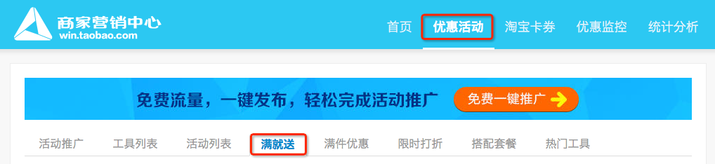 通过卖家中心——促销管理,进入商家营销中心,选择优惠活动中的满就送