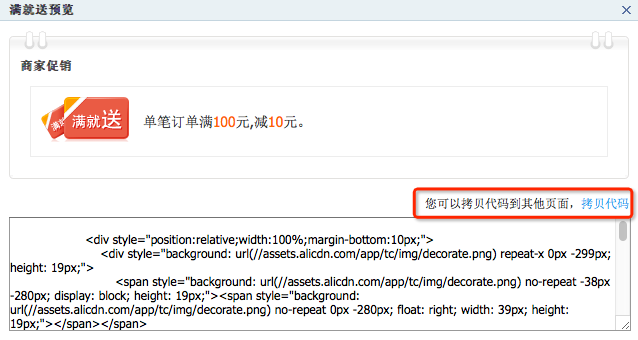 可在设置好满就送活动后,在预览中利用“拷贝代码”功能,然后在店铺装修页面合适的位置添加一个模块,编辑该模块,选择编辑源代码,将复制的代码粘贴保存,保存完以后点发布按钮,则在店铺首页就可以看到设置的促销页面了。