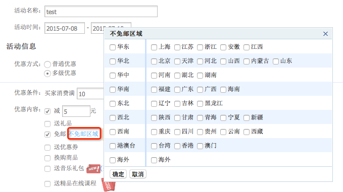 进入满就送设置后台,在原有的免邮右侧增加“不免邮区域”选项,点击展开后就可以勾选不免邮区域。