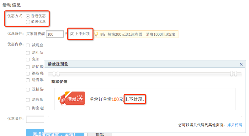 首先,满就送上不封顶必须是单级优惠,多级优惠的满就送不支持上不封顶。其次,卖家必须勾选优惠条件中的上不封顶选项方能生效。