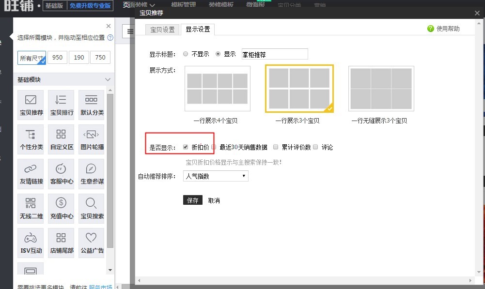 订购了限时打折服务,如何让买家在店铺首页看见? 大文 四月 19, 2016 卖家工具及服务 0 条评论 1492 围观 目前限时打折活动设置后还不能实现直接在店铺首页显示推广,您可以通过店铺装修中的“宝贝推荐”模板,让参加限时打折的商品的折扣价展示给买家。 您可进入【卖家中心】-【店铺管理】-【店铺装修】-【页面装修】-【基础页】-【首页】中的宝贝推荐模块,点击“编辑”,在显示设置中把是否显示“折扣价”勾选上即可。