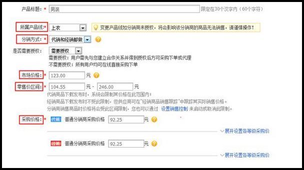 f)  零售价范围:分销商发布该产品在自己店铺内时需遵守的价格标准,若其输入的零售价格在此范围以外,则不能将商品发布成功;