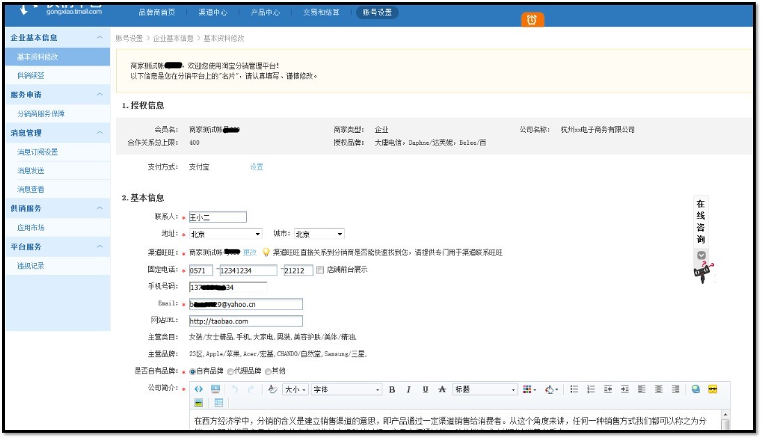 供应商基本资料维护介绍 大文 四月 21, 2016 卖家平台 0 条评论 1316 围观 1、基本信息:联系人;联系固话(手机号码);email;阿里旺旺(建议用已认证过的账号或商城店铺的阿里旺旺子账号) 注意:此处所留信息,需是直接管理此分销业务的联系人信息。 2、主营类目:系统智能匹配 3、主营品牌:系统智能匹配 4、是否自有品牌:请选择以上品牌是您的自有品牌还是代理品牌。如出现既有自有品牌又有代理品牌时,请选择其它。 5、公司介绍:您企业的相关介绍,也可进行品牌的介绍。 立刻点此提交申请,成为供应商。如以上知识未解决您的问题,请点此进入人工服务