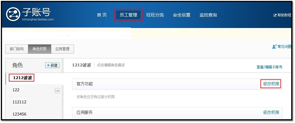 3、选择【员工管理】-【角色权限】,选择对应的子帐号,【修改权限】。