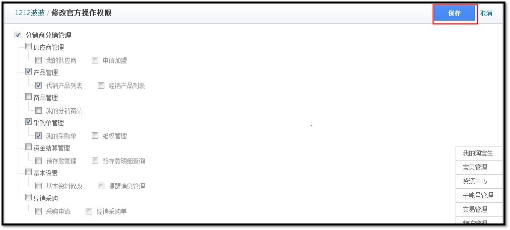 4、每个角色的权限的菜单项,可选择性添加或修改,设置相应权限并保存(仅以分销商为例):
