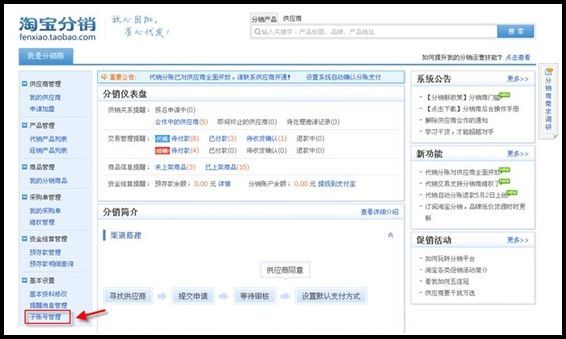 1、进入分销平台,点击【基本设置】-【子账号管理】: