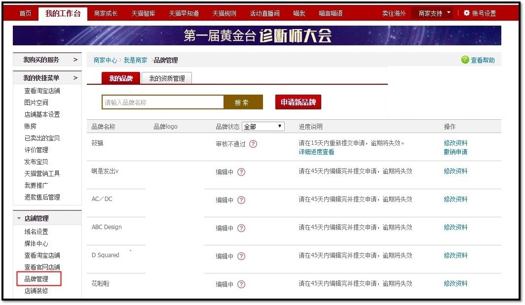 查看提示下载/关联失败的那款产品的品牌时,需要注意品牌名称必须要完全一致才可以,有时候可能是同一个品牌,但分销商得到授权的是中文,而供应商发布的产品是英文,这时也会下载/关联失败的,碰到这种情况需要分销商在向天猫申请添加英文品牌才行,如何申请请点击查看。