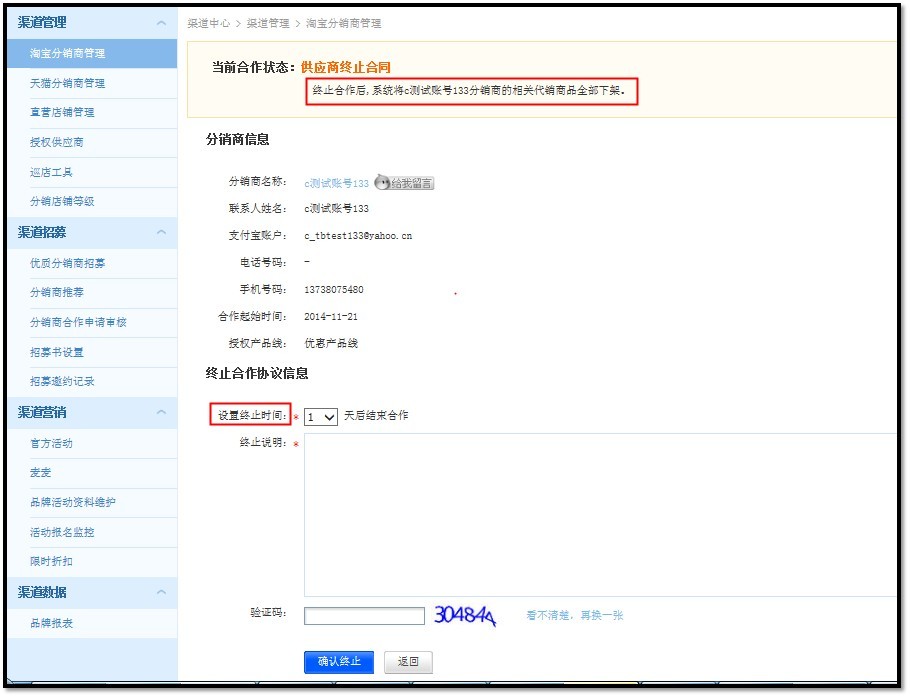 设置终止时间并保存,最短1天,最长15天后,系统会自动终止分销商和您的合作