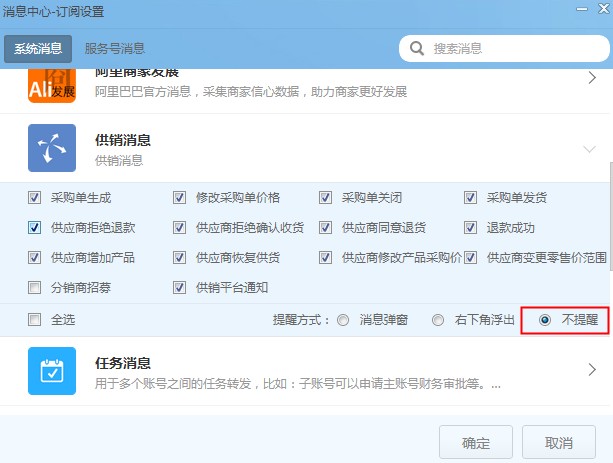 如何订阅分销系统的通知消息? 大文 四月 21, 2016 卖家平台 0 条评论 1640 围观 登陆供销平台分销商后台,进入【基本设置】-【提醒消息管理】,可以设置各类分销平台通知消息的接受方式。 或者是在千牛工作台【消息中心】-【订阅设置】-【系统消息】-【供销消息】,勾选提醒或者不提醒。