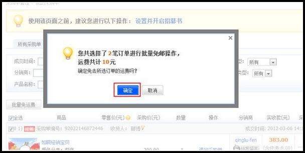 供应商如何设置批量免运费? 大文 四月 22, 2016 卖家平台 0 条评论 1388 围观 进入[采购单管理]-[我的采购单],点击[等待付款]筛选出所有等待付款的采购单,勾选需要免运费的采购单后,点击[批量免运费]按钮,如图: 点击“批量免运费按钮”后弹出确定页面,确认无误后点击“确定”按钮即可。