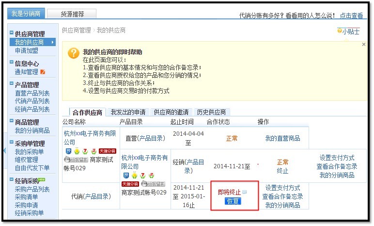 注意:如果您选择在1天后终止,那么系统会在1天后的晚上12点终止合作关系,在系统终止前,供应商也可以手动确认同意,供应商确认同意后,合作关系立刻终止。