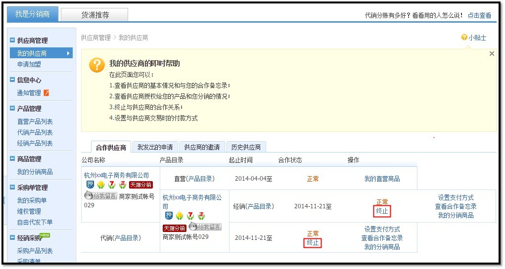 登录分销平台,进入“供应商管理”—“我的供应商”,找到想要终止的供应商,点击右边的“终止”按钮(直营终止需供应商操作)