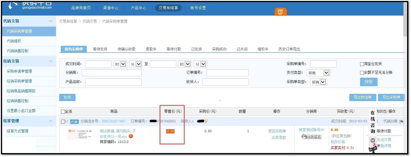 如何监控分销商品的实际销售价格? 大文 四月 22, 2016 卖家平台 0 条评论 1720 围观 1.你可以进入【渠道中心 】-【 渠道管理 】- 【巡店工具 】-【 价格跟踪】查看 2.您可以进入【交易和结算 >】-【代销交易 】-【代销采购单管理】, 在采购单列表中,会显示出分销商品买家购买时支付给分销商的实际价格,供应商可以在处理采购单的时候核对该信息。 立刻点此提交申请,成为淘宝供应商