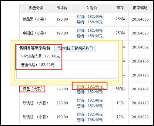分销商设置等级折扣价格,但生成的采购单价格不一样? 大文 四月 22, 2016 卖家平台 0 条评论 1554 围观 供应商给分销商设置了等级折扣价格,但是生成的采购单价格却不一样,主要是由于用户设置不当造成的,所以请仔细查看自己的设置。 如果产品存在多个规格(颜色、尺码),则请查看每个规格上的采购价,点击进入“产品管理”—-“我的产品库”,找到有问题的那款产品后点击“编辑”,然后请查看分销商所采购那款颜色尺码,点击“展开”会显示每个等级的价格,这时请确认分销商的等级是否和这里的设置一致。