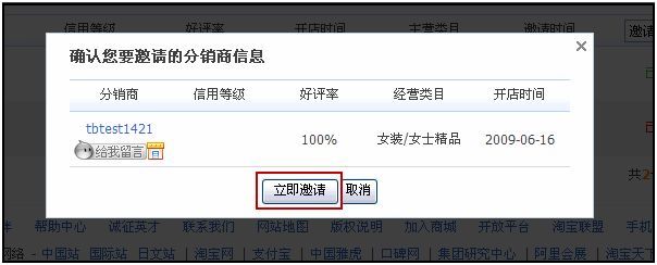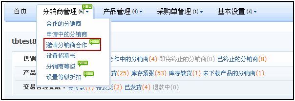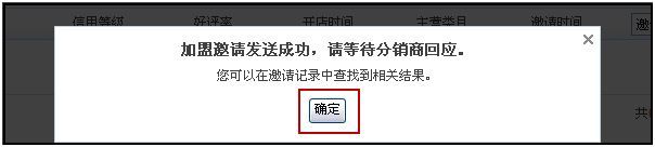 如何邀请天猫用户成为你的分销商 大文 四月 22, 2016 卖家平台 0 条评论 2263 围观 如需邀请天猫的用户成为您的分销商,可按如下步骤操作向分销商发起邀请即可; ①路径分销商管理——邀请分销商 ②输入需要的,邀请即可。 注:输入的若已成为供应商时,会出现以下提示 注:1、对分销商发出邀请,30天后才可重复提交 2、 分销商拒绝邀请,7天后才可重新发出邀请