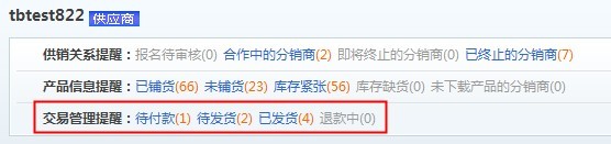 1、操作换账号前原天猫供应商账号的供销平台交易必须全部完毕,无任何进行中的订单,即下图中交易管理中待付款、待发货、已发货、退款中数字全部为“0”