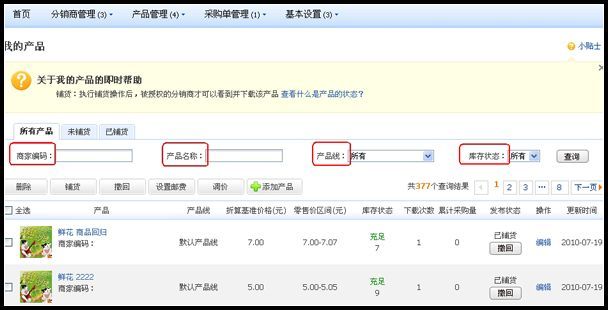 供应商如何查找以及管理已经发布的产品? 大文 四月 22, 2016 卖家平台 0 条评论 2846 围观 登陆分销平台,进入【产品管理】-【我的产品】,可查看和编辑自己所有已经发布的产品。亦可根据商家编码、商品标题、产品线及库存状态,来搜索产品。