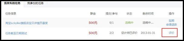 怎么对于任务做评价? 大文 四月 23, 2016 卖家平台 0 条评论 1288 围观 进入“个人中心”——“我的任务”——“我提交的任务”,点击“评价” 您可以从三个维度对服务商进行评价。还可以输入详细的评价用语。