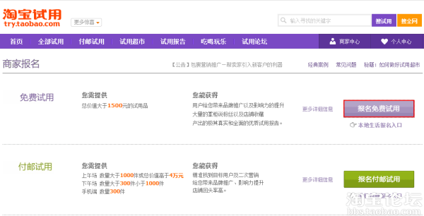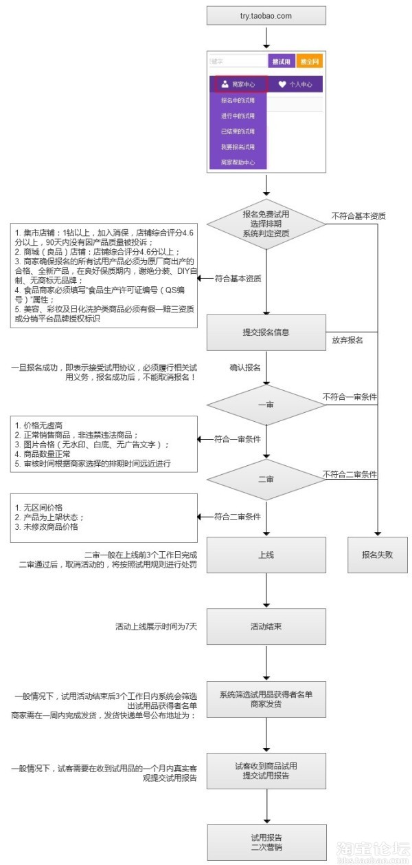 详情见免费试用招商条件:http://try.taobao.com/shoper_condition.htm