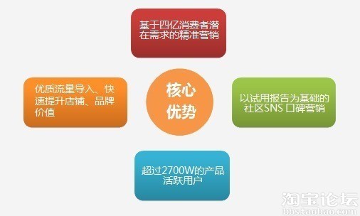 淘宝试用中心是全国最大的免费试用中心,最专业的试客分享平台。试用中心作为集用户营销、活动营销、口碑营销、商品营销为一体的营销导购平台,为数百万商家提升了品牌价值与影响力!商家通过提供免费试用品,不仅能够导入优质流量、快速提升店铺和品牌的价值,后续的试用报告更可以为商家带来持续的口碑效应。