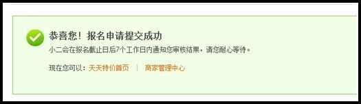 我是天天特价报名商家,怎么样才知道自己报名成功了 大文 四月 25, 2016 卖家活动 0 条评论 1529 围观 天天特价活动报名成功会显示如下的提示: 如果不是以上这种情况提示,请根据不同的提示了解您报名失败的原因或者打客服电话咨询。 请随时登录天天特价“商家中心—商品管理” 查询报名中的宝贝状态,查询入口点此进入。