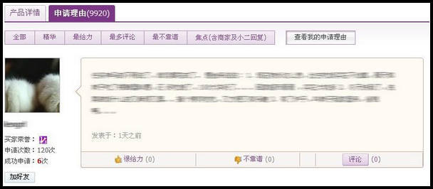 免费试用申请理由到哪里去看? 大文 四月 25, 2016 卖家活动 0 条评论 1591 围观 您可以到“试用中心”右侧“我的试用”中去查看已经申请免费试用的宝贝,点击“查看详情”,就可以看到自己的申请理由; 提醒:申请理由一旦提交将不能修改。