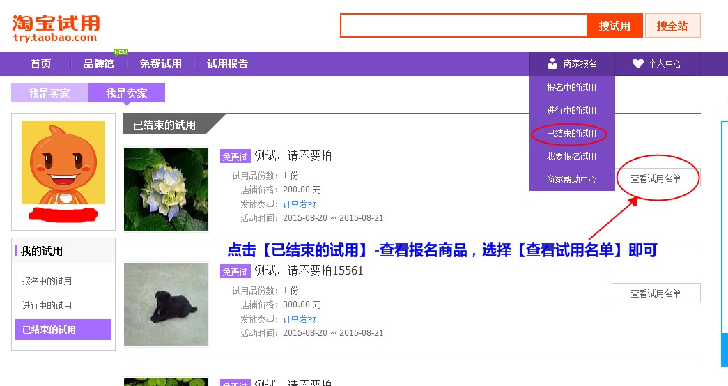 试用商品怎么查看有没有成功记录,买家需要拍下吗? 大文 四月 25, 2016 卖家活动 0 条评论 1718 围观 亲,试用会员不需要进店拍下商品,试用商品也没有成交记录。活动结束后,商家按照在试用中心商家后台查询到的试用者名单,联系试用者确认尺码、地址、快递方式、收货人等问题,然后在一周内为试用者发货。 试用名单查询路劲:进入【淘宝试用】-【商家报名】-【已结束的试用】查看参加试用的商品,选择【查看试用名单】即可