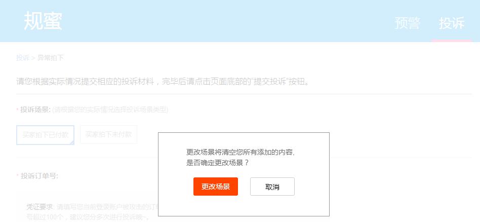- 在选择【异常拍下】时,可根据需要切换投诉场景类型,但切换场景将清空您所有添加的内容,请谨慎选择切换哦。