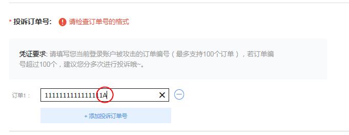 - 请填写正确有效的订单号、举证号哦,不支持包含文字、字母、空格、符号等非有效字样哦。