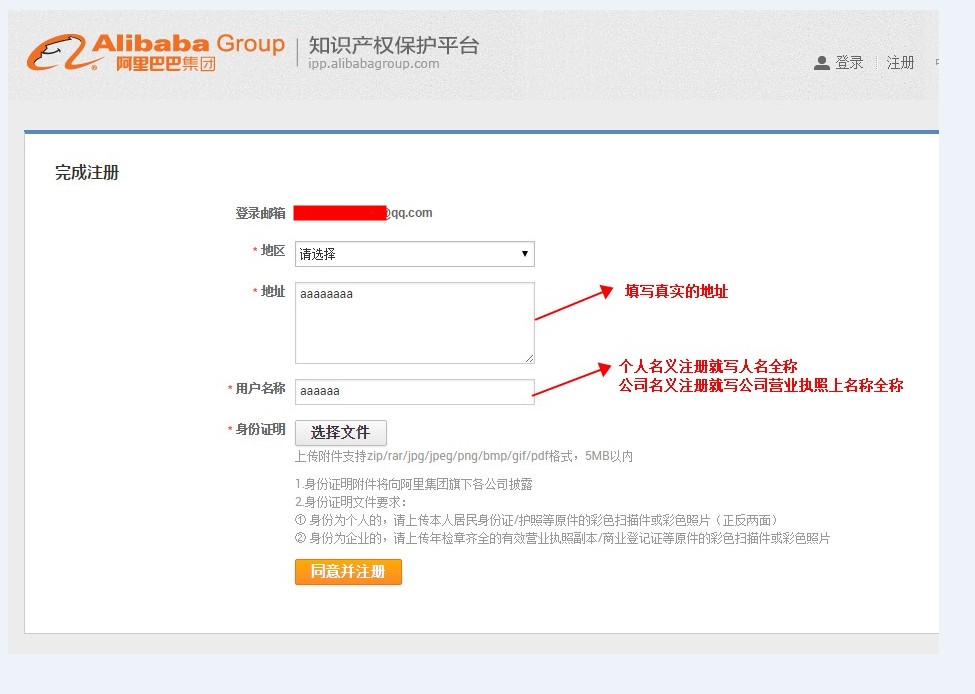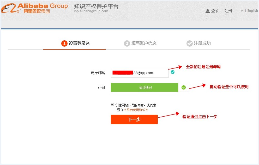 第一步:首次登录阿里巴巴知识产权保护平台点此注册 。注册帐号,注册邮箱需要从来没有注册过淘宝,阿里巴巴或支付宝等账户,否则注册会提示操作异常,建议使用全新的公众邮箱注册投诉系统。