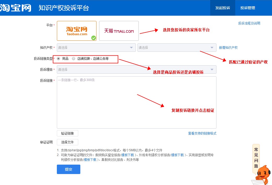 说明:淘宝网受理的知识产权侵权投诉类型包括:专利权侵权投诉、商标权侵权投诉以及著作权侵权投诉。发起投诉须提供: