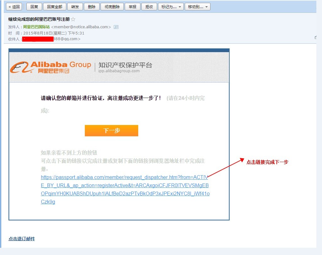第二步:您在收到 “继续完成您的阿里巴巴账号注册”的邮件后可点击超链接,进入下一步注册。(注意邮件可能会有延迟,建议等待10分钟左右)