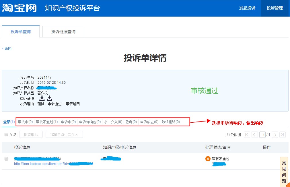 第八步:查询处理结果,处理反通知即卖家的申诉。收到提醒处理反通知的邮件及旺旺和站内信通知,”待投诉方回应反通知”的状态,需要点击”查看申诉”进行回应,逾期不处理,系统默认为撤销投诉。针对会员提出的反通知,可选择”撤诉”或者”申请淘宝介入”。若撤诉,链接恢复,投诉处理完毕。若申请淘宝介入,同样可通过”投诉链接查询”查看最后申诉结果。