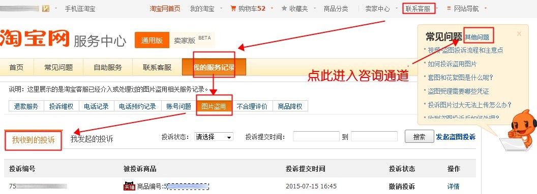 方法一:登陆淘宝网首页-【联系客服】-【自助服务】-【违规受理】-【盗用图片受理】-【被投诉方
