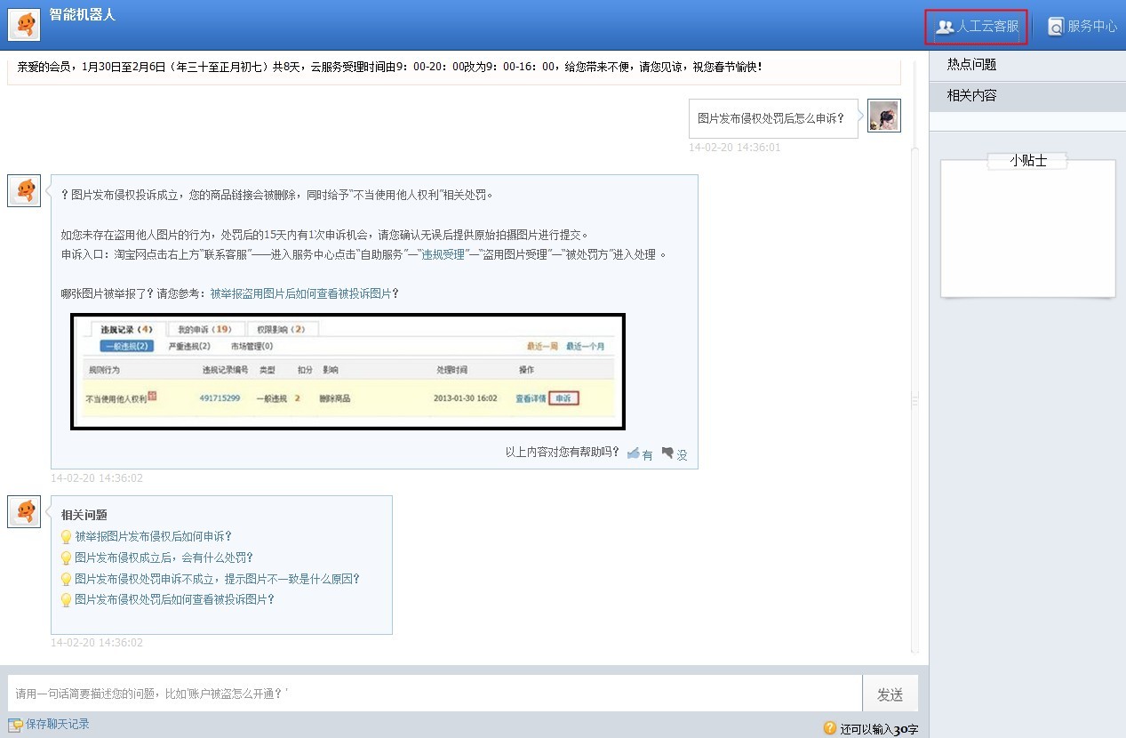 点击”其他问题“后,您可以在智能机器人内输入您的问题,若没有找到可以点击右上角”人工云客服”进行咨询