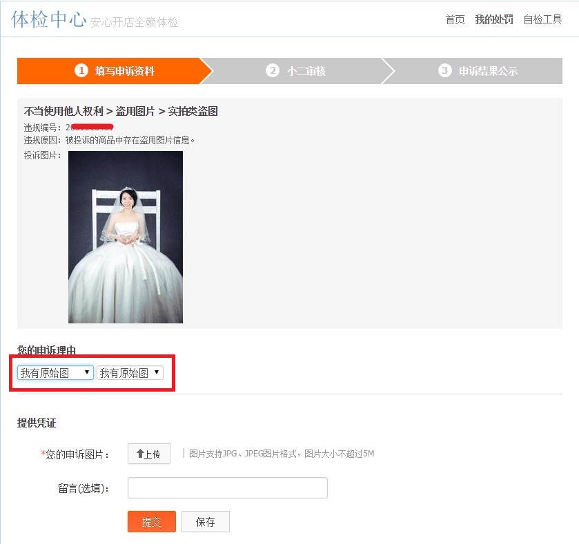 若投诉图是您自己拍摄,您需要提供投诉图对应的原始拍摄图,图片格式JPG\JPEG,文件大小在5M以内。
