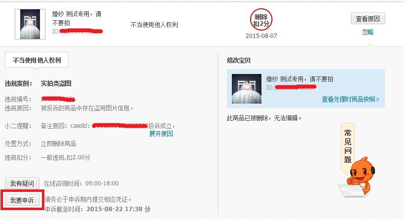 淘宝网【卖家中心】-【体检中心】=【不当使用他人权利】您可以点击申诉按钮,进行申诉。