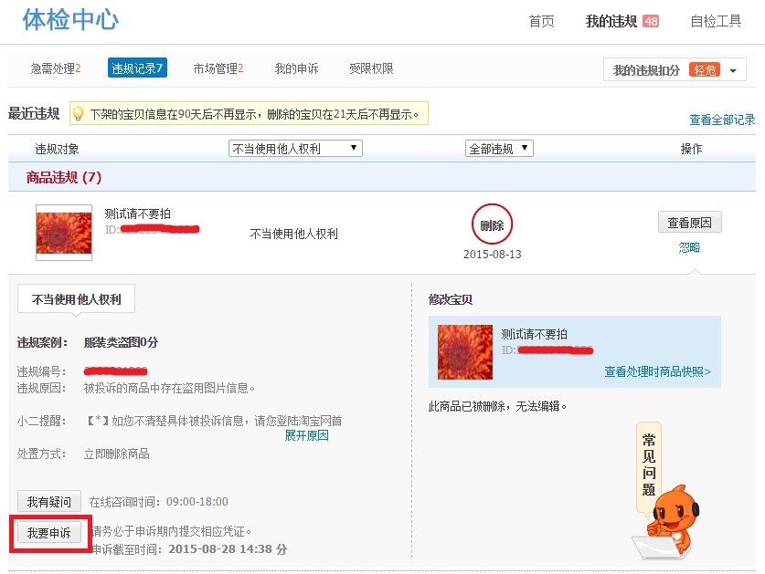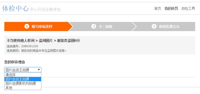 第一步:收到处罚通知后,您可以通过以下路径查看被处罚的商品及原因:【淘宝网】-【卖家中心】-【体检中心】-【不当使用他人权利】