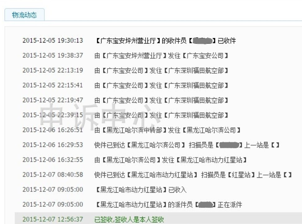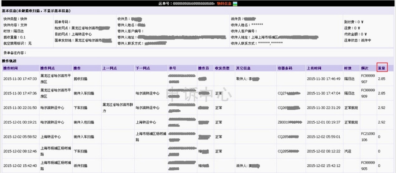 虚假交易处罚申诉-快递公司内部跟踪截图示例