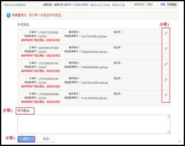 按步骤1,步骤2,步骤3重新填写发货凭证信息,填写申诉理由后,点击提交即可!