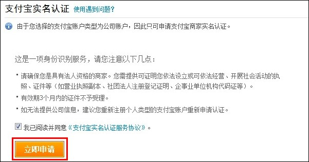 在支付宝网站注册企业账户 大文 五月 11, 2016 注册 0 条评论 1709 围观 支付宝账户分为个人和公司两种类型,请根据自己的需要慎重选择账户类型,公司类型的支付宝账户一定要有公司银行账户与之匹配。账户类型是不能修改的 1 登录支付宝账户( www.alipay.com), 点击【立即注册】 2 点击【企业账户】,填入电子邮箱和验证码【公司账户只能邮箱注册】,点击【下一步】 3 验证手机 4 点击【立即查收邮件】,进入邮箱 5 在邮箱中会收到一封激活支付宝账户的邮件,点击【请激活您的支付宝账户】 6 点击【继续注册】 7 填写相关信息,点击【确定】 8 申请公司类型的支付宝账户,需进行支付宝实名认证,点击【立即申请】。 如果您还没有准备好公司认证的相关资料,走到这一步说明您的支付宝账户已经注册成功,可以登录支付宝账户,进行网上购物的操作